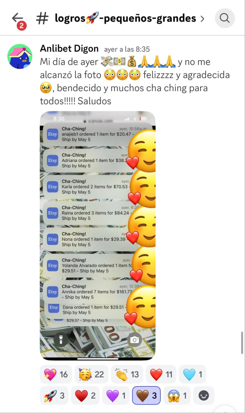 “Trabajo full time y le dedico dos horas diarias a mi negocio online. Aun así, en solo tres meses vendí más de $20,000 USD con mi tienda de Print on Demand. Esto me ha demostrado que sí es posible construir un ingreso extra sólido sin dejar a un lado a mi familia.”